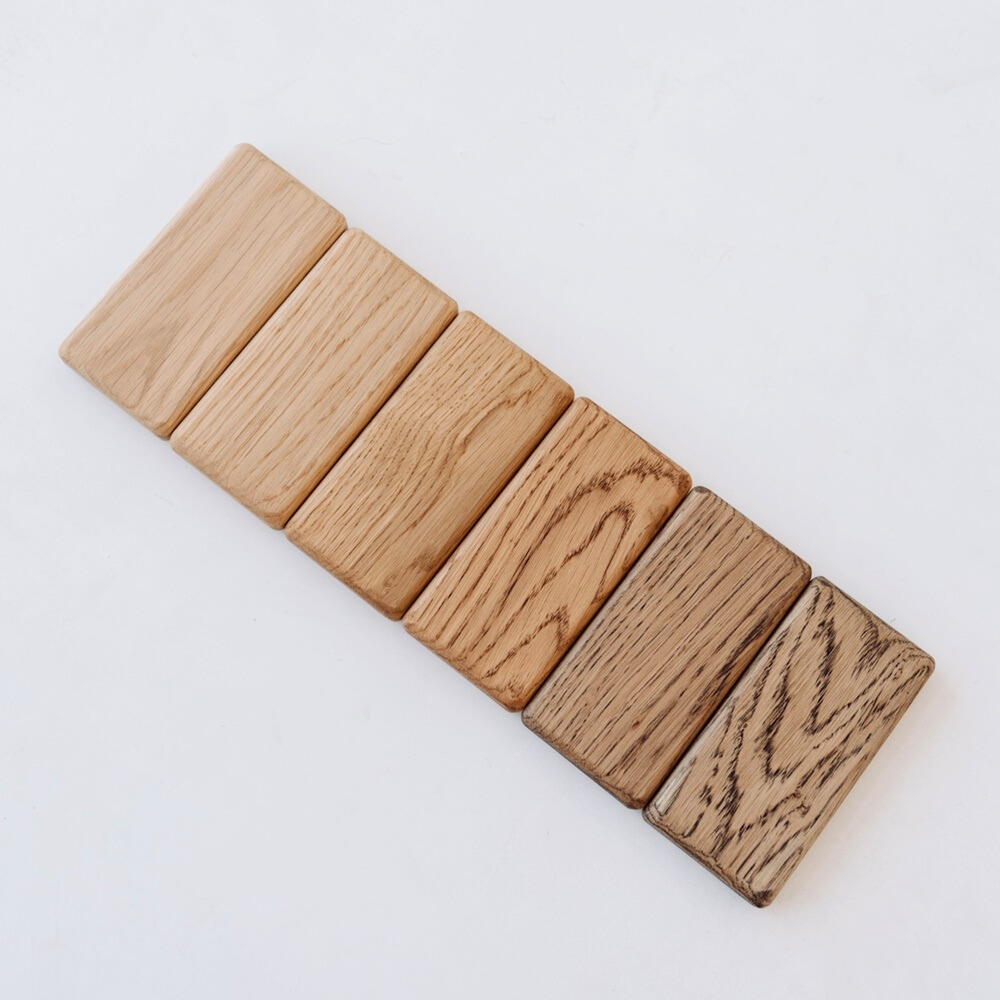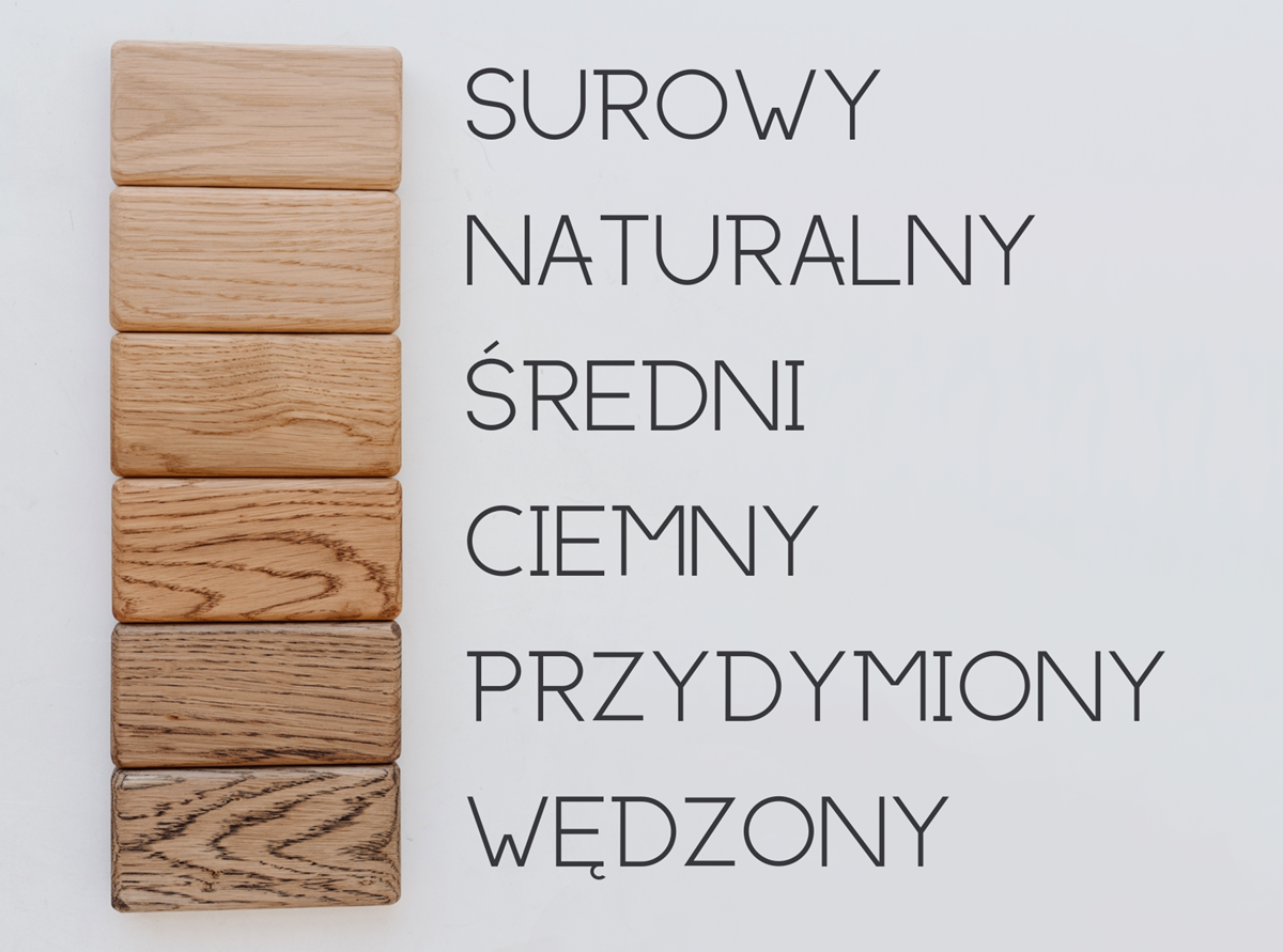 Oto kompozycja 6 różnych odcieni wybarwienia drewna dębowego olejowoskami OSMO – zaczynając od chłodnej wersji SUROWEJ oraz najbardziej uniwersalnej i najpopularniejszej wersji NATURALNEJ, przechodząc przez cieplejsze tony wersji ŚREDNIEJ i CIEMNEJ, a kończąc na wyrazistej wersji PRZYDYMIONEJ I WĘDZONEJ